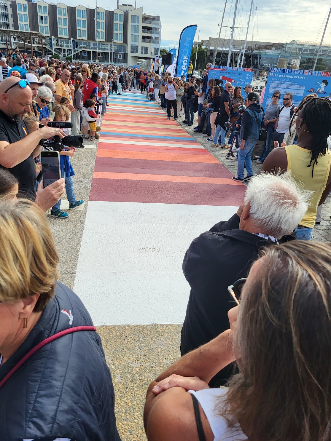 Nous étions présents ce samedi 27 septembre pour l’inauguration de la frise géante « Warming Stripes » installée sur le quai de la Georgette à La Rochelle.