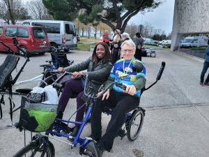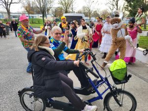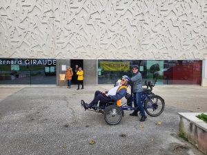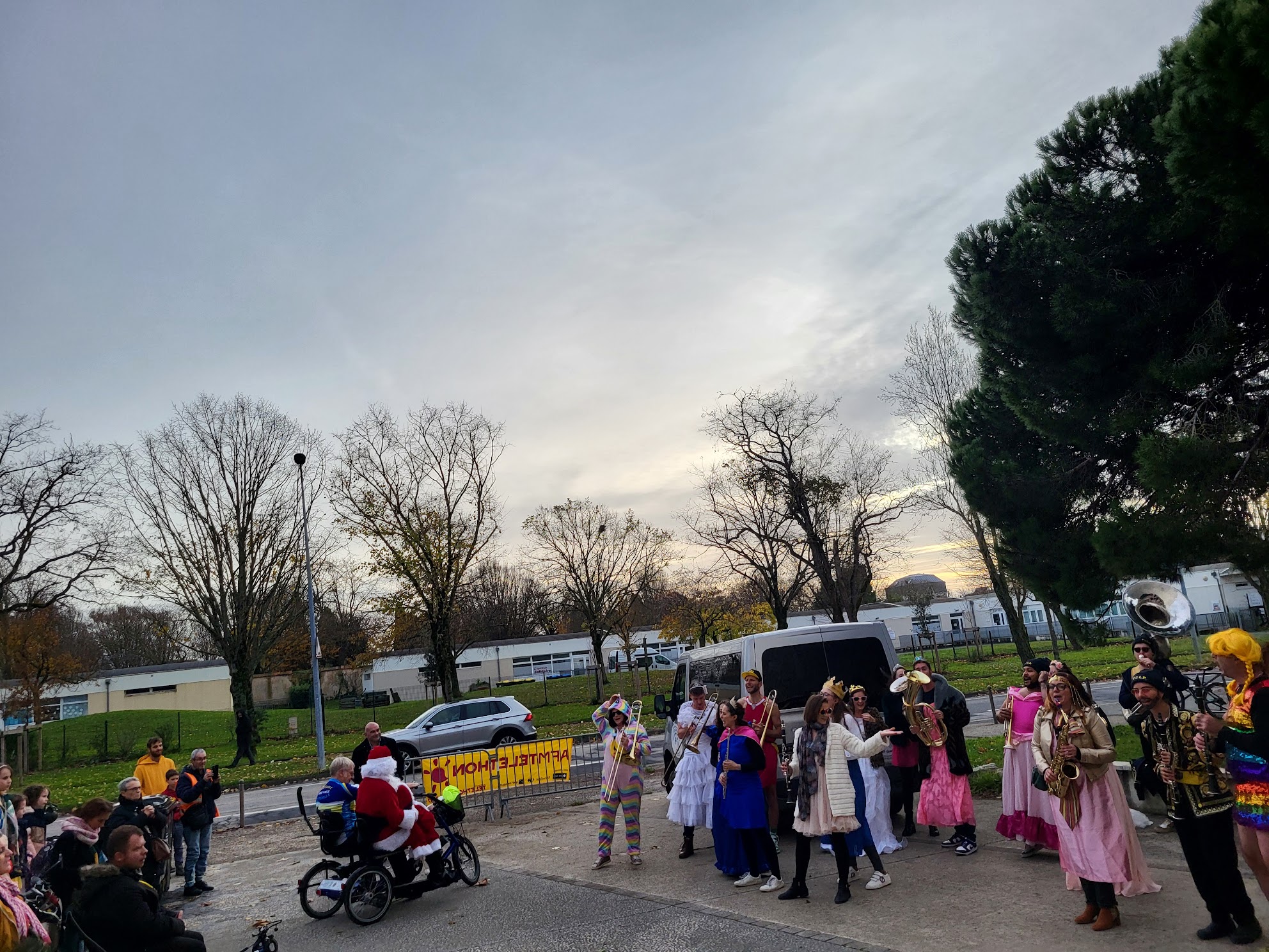 Ambiance festive à la salle Bernard Giraudeau de Mireuil. Participants déguisés et présence du Père Noël à cette occasion pour essayer nos vélos spéciaux.